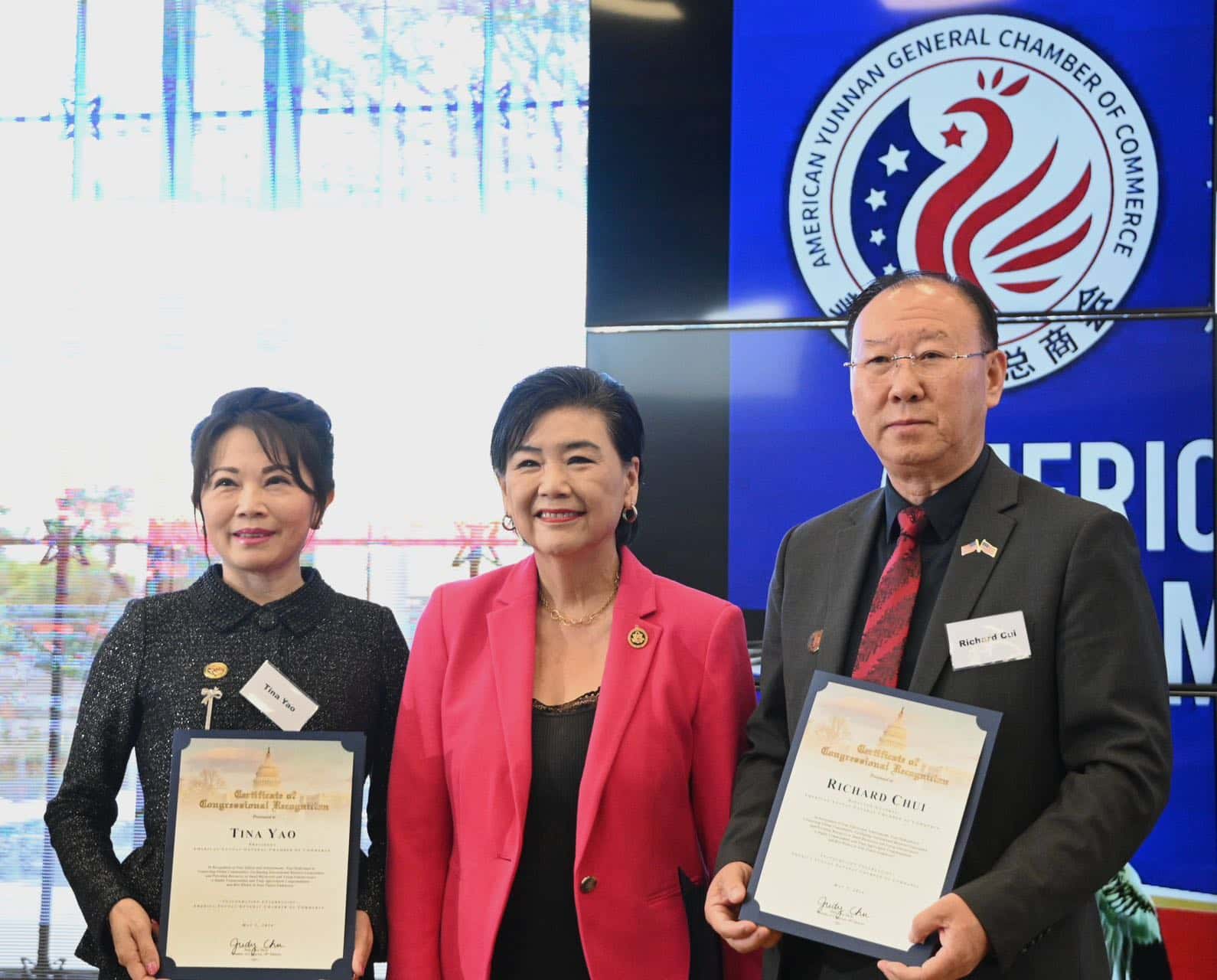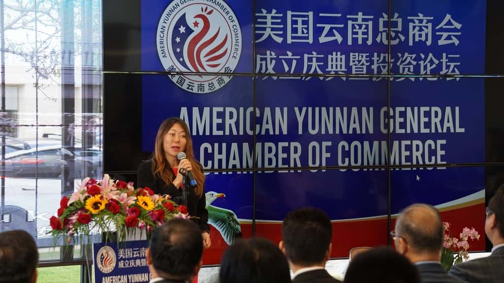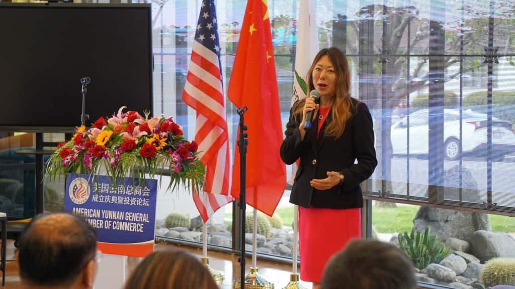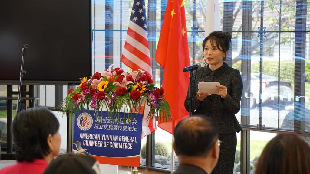 随后,创会会长姚依娜发表了热情洋溢的致辞,介绍了美国云南总商会的背景、宗旨以及未来的愿景。姚依娜在致辞中强调了商会的重要性,以及其在促进中美友好关系和商贸合作方面的使命。